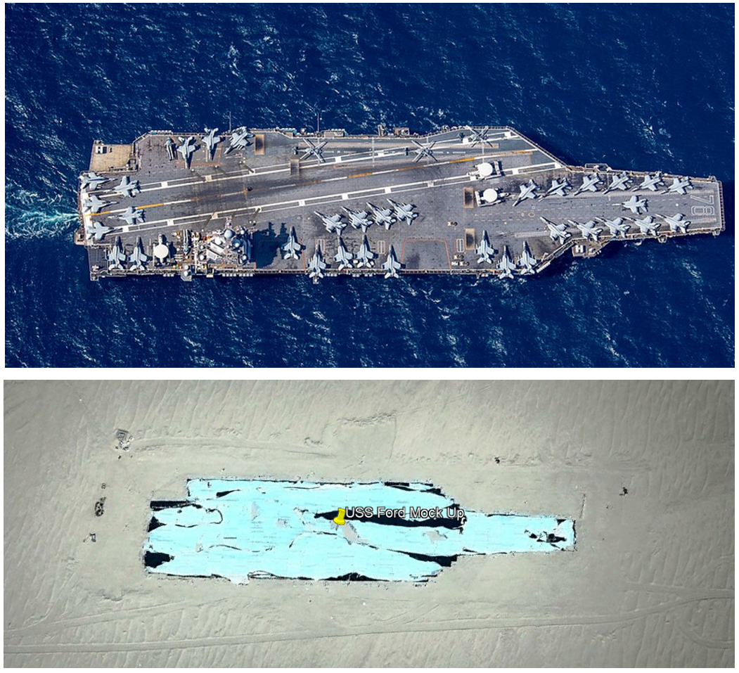 (U) Located in China’s Xinjiang region, the Taklamakan Desert is home to a vast PLA training area used for missile and strike training. In the SE corner of the desert, one training range appears to have a full scale outline of the American Ford class nuclear powered aircraft carrier.