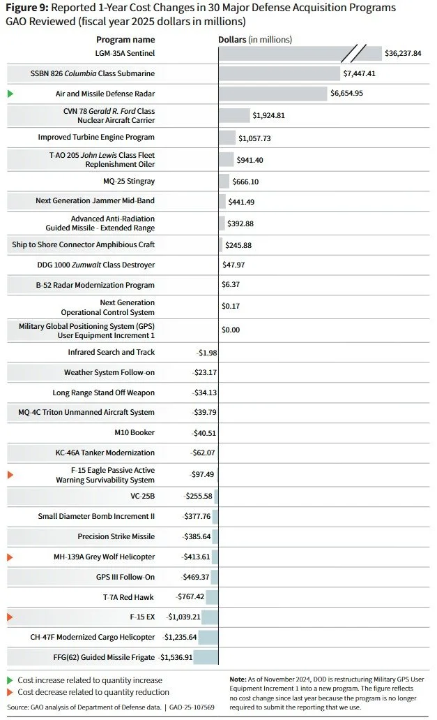 Among the 30 MDAPs assessed in both our current and last report, 16 programs reported a cost decrease and 13 reported an increase in the last year (see fig. 9). Of the16 programs that reported a decrease, three were due to reduced quantities. Program officials for the Navy’s FFG 62—the program with the largest cost decrease—attributed the decrease to accounting changes, not savings from efficiencies. Specifically, these officials noted that the cost decrease is due, in part, to the Navy’s revised approach for accounting for inflation. The Army’s CH-47F program—the second largest decrease—is updating its cost estimates as part of a new program baseline.